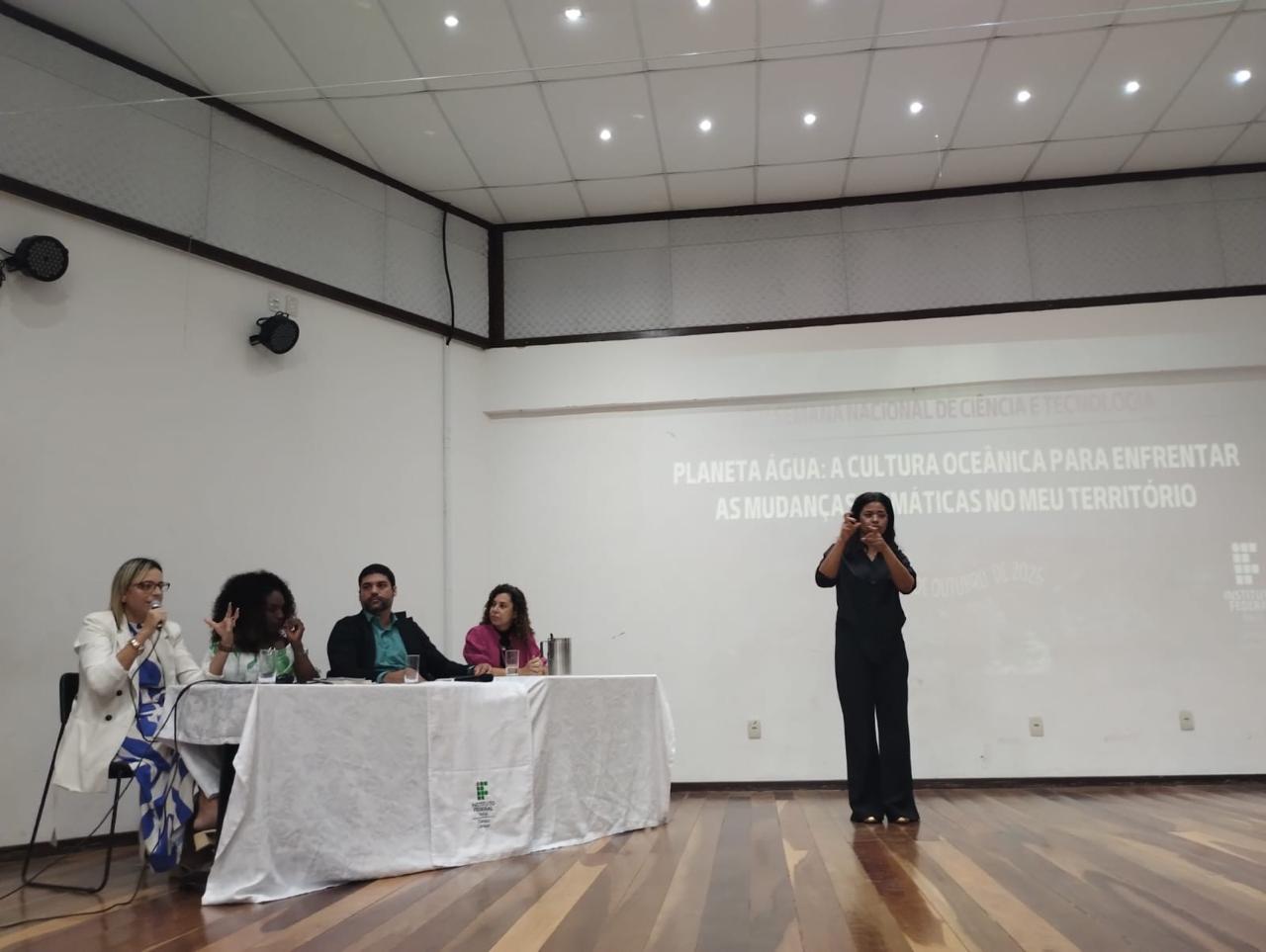 No Instituto Federal da Bahia, Dávila apresentou a palestra “As fibras que nos atravessam”, trazendo dados sobre a contaminação por microfibras têxteis nos oceanos — já identificadas no sangue, placenta e até no esperma humano.